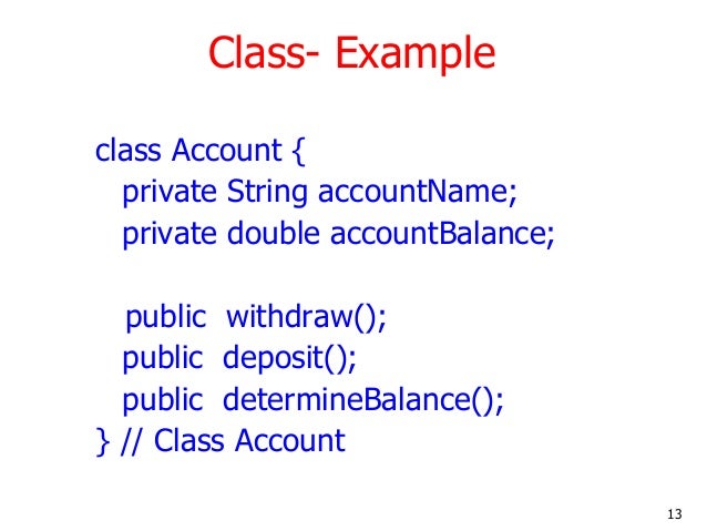 - 13. Class- Exampleclass Account { private String accountName; private double accountBalance; public withdraw(); public deposit(); public determineBalance();} // Class Account 13