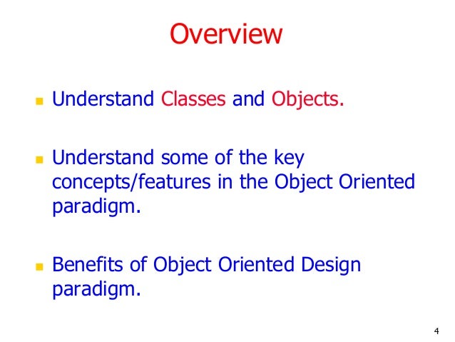 - 4. Overviewn Understand Classes and Objects.n Understand some of the key concepts/features in the Object Oriented paradigm.n Benefits of Object Oriented Design paradigm. 4