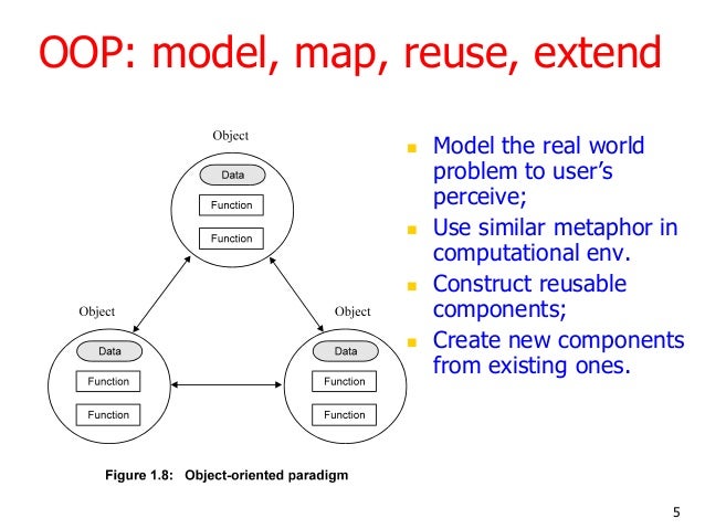 - 5. OOP: model, map, reuse, extend n Model the real world problem to user’s perceive; n Use similar metaphor in computational env. n Construct reusable components; n Create new components from existing ones. 5