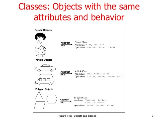 - 7. Classes: Objects with the same attributes and behavior Person Objects Abstract Person Class Into Attributes: Name, Age, Sex Operations: Speak(), Listen(), Walk() Vehicle Objects Abstract Vehicle Class Into Attributes: Name, Model, Color Operations: Start(), Stop(), Accelerate() Polygon Objects Polygon Class Abstract Attributes: Vertices, Border, Into Color, FillColor Operations: Draw(), Erase(), Move() Figure 1.12: Objects and classes 7