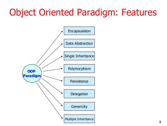 - 8. Object Oriented Paradigm: Features Encapsulation Data Abstraction Single Inheritance Polymorphism OOP Paradigm Persistence Delegation Genericity Multiple Inheritance 8